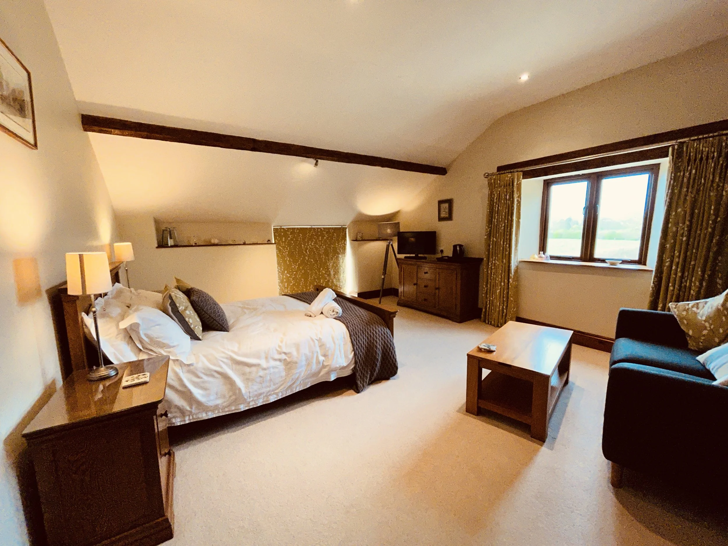 The Orchard Room features a king size bed with luxury bed linen, a spacious ensuite and ample storage. There is room for relaxation with a seating area equipped with a television, bar fridge and coffee machine.